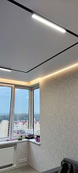Белый матовый натяжной потолок Bauf с трековым освещением.